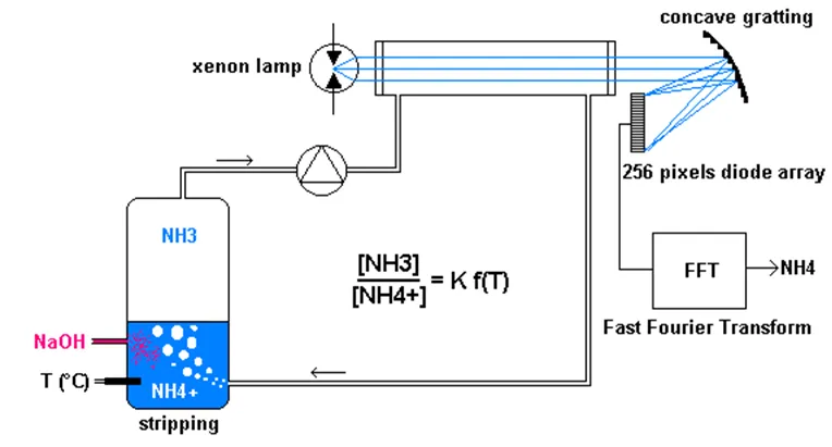 O analisador de amônia realiza em seguida a análise do espectro de absorção típico do amoníaco NH3, identificando o espectro especifico do NH3 através de um procedimento matemático conhecido como Transformada Rápida de Fourier (FFT), permitindo determinar a concentração inicial de NH4 na amostra. A cada medição, um zero automático é realizado.
