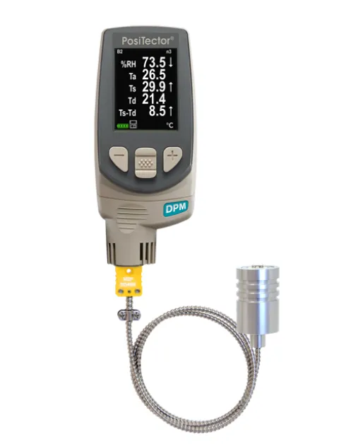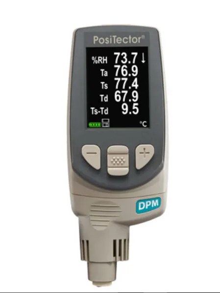 O resultado da medição de ponto de orvalho de uma amostra é indicado pela temperatura do ar ambiente (Ta), a temperatura da superfície (Ts), a umidade relativa (RH), a temperatura do ponto de condensação (Td) e a temperatura da superfície menos a temperatura do ponto de condensação, o que é um indicador crítico da probabilidade de formação de condensação. Se o PosiTector DPM detectar uma diferença menor (valor delta), ocorrem três coisas: o contraste do visor inverte, o LED vermelho ascende e o alarme do medidor emite um sinal sonoro.