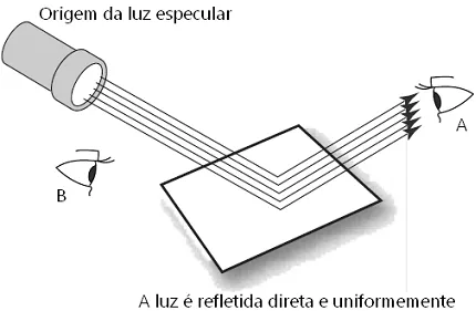 O comportamento reflexão especular, a fonte de luz irradia o feixe de luz, o qual incide sobre a superfície do objeto e todo o feixe de luz reflete em direção a fonte de luz em um único ângulo de reflexão. É o comportamento da imagem do objeto, observada pela reflexão da luz pelo espelho. No comportamento reflexão difusa o feixe de luz incide sobre uma superfície e os raios da luz refletem em diversas direções, em vários ângulos de reflexão. É o comportamento do efeito da imagem observada através da neblina.