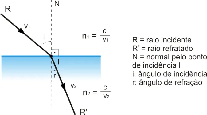 Ao passar obliquamente sobre uma superfície que altere o seu meio, a luz incidente passa a ser refratada pelo material, tendo a sua velocidade alterada. A razão entre a velocidade da luz no meio 1 e no meio 2 é chamada de índice de refração relativo. Passa-se a ser lida através da fórmula matemática: n21 = v1 / v2.