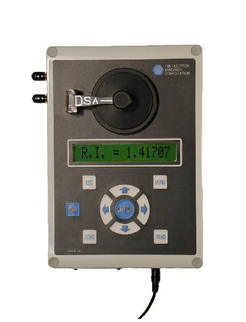 O medidor de índice de refração Electron Machine trabalha com o princípio de medição do ângulo crítico, incidindo energia radiada do LED, que por sua vez, atravessa a superfície do prisma, sendo refletido para o processo. A luz alcança a interface do prisma a interceptando em uma série de ângulos, conferindo ao processo o ângulo crítico da medição; quando a luz cruza a interface em um ângulo maior do que o ângulo crítico, ele é refratado para a solução; quando cruza em um ângulo menor, ele é refletido do espelho para o prisma e depois é escaneado pelo CCD linear array (matriz de diodos com 2592 pixels, que converte energia luminosa em energia elétrica). O CCD é responsável por enviar o sinal de 4 a 20mA ou de 0 a 10V; a sensibilização do CCD é proporcional à variável de processo. O medidor de índice de refração realiza leituras nas unidades: °Brix, % de sólidos, °Baumé, etc.